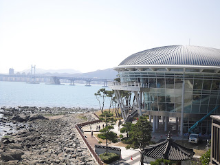 Last weekend, we stopped in Haeundae to go to the beach on a day the weather was decent. We were already out so I didn't bring any trunks so I didn't go in the water instead we walked to the Nurimaru APEC (Asian-Pacific Economic Cooperation) House. I am not completely interested in the trade agreements between countries, to be completely honest I think it's pretty boring. But the walk from Haeundae to Nurimaru was completely worth it. There was a nice wooden walk way that was a border from the rocky shore and nice forested area. A bonus was Nurimaru has some nice architecture and although looking at pens and pieces of paper about some trade agreement is pretty boring I did enjoy the overall environment of the building.